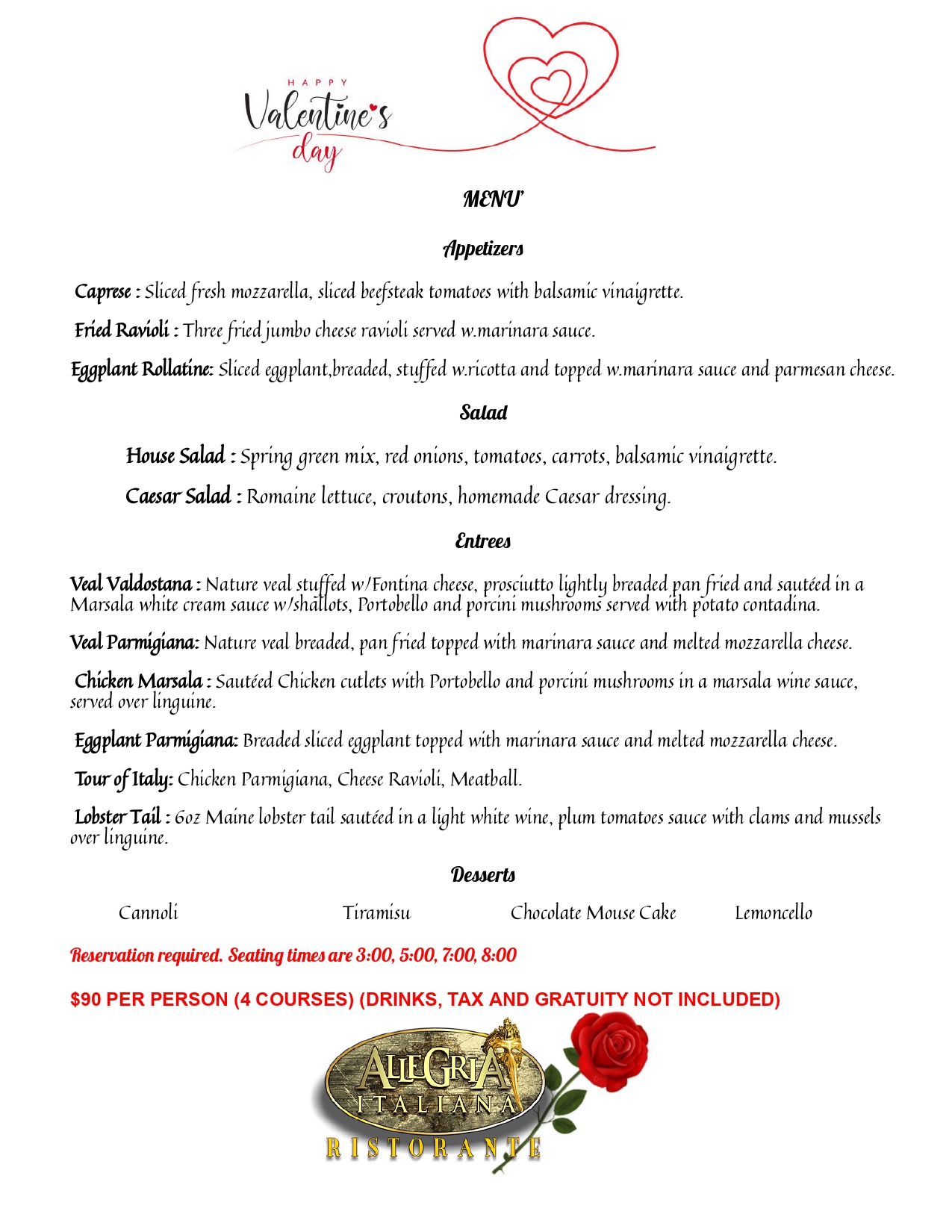 Allegria Italiana Ristorante introduces a contemporary concept along with traditional pasta dishes at affordable prices, from Spaghettini al Pomodoro e Basilico, home-made Gnocchi Sorrentino, Pesto, Formaggi e Spinacci, to Astice and Crab Ravioli in Roasted Garlic Cream Sauce, a fantastic Ossobuco over Saffron Risotto, and many more classic plates.